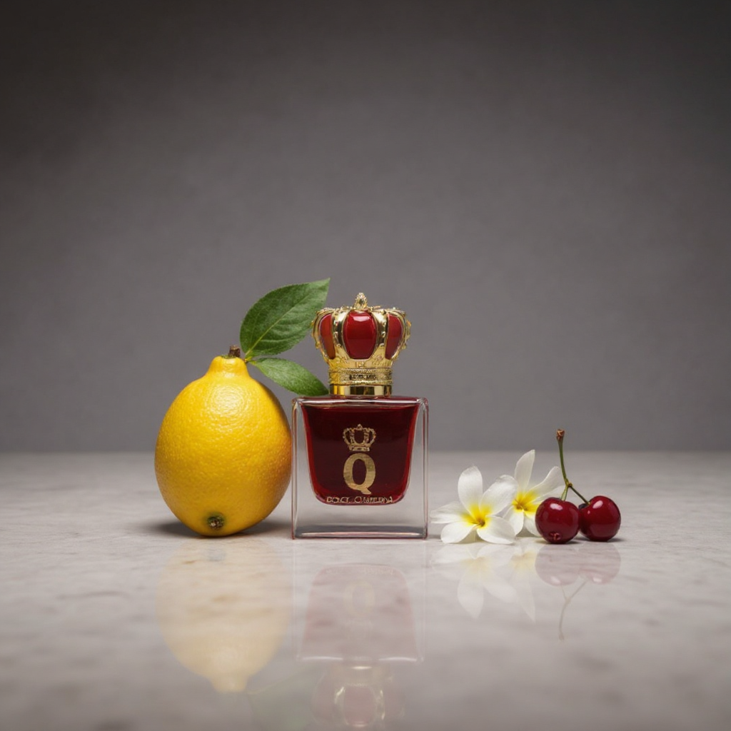 O Q by Dolce & Gabbana Eau de Parfum começa com uma saída fresca e cintilante de limão da Sicília e laranja sanguínea, equilibrada por uma cereja suculenta que dá um toque frutado mais adocicado. No coração, surgem notas florais delicadas de jasmim e heliotrópio, que acrescentam feminilidade e suavidade. Na base, o almíscar cristalino e o cedro conferem profundidade, elegância e um lado mais seco e sofisticado. O conjunto resulta num perfume moderno, luminoso e sensual, que combina frescura cítrica com um toque frutado e um fundo elegante, pensado para transmitir energia e confiança.