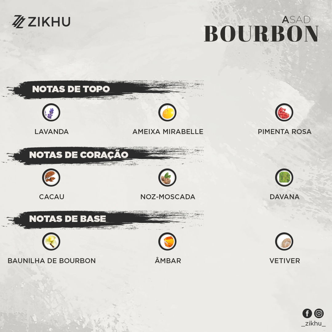 O Asad Bourbon da Lattafa é uma fragrância unissexo da família olfativa oriental especiada, lançada em 2025. A sua composição começa com notas de topo de lavanda, mirabelle e pimenta rosa, criando uma abertura fresca e ligeiramente picante que desperta os sentidos. No coração, destacam-se as notas de cacau, noz-moscada e davana, conferindo um toque quente e especiado à fragrância. A base é composta por baunilha bourbon, âmbar e vetiver, proporcionando profundidade e sofisticação.