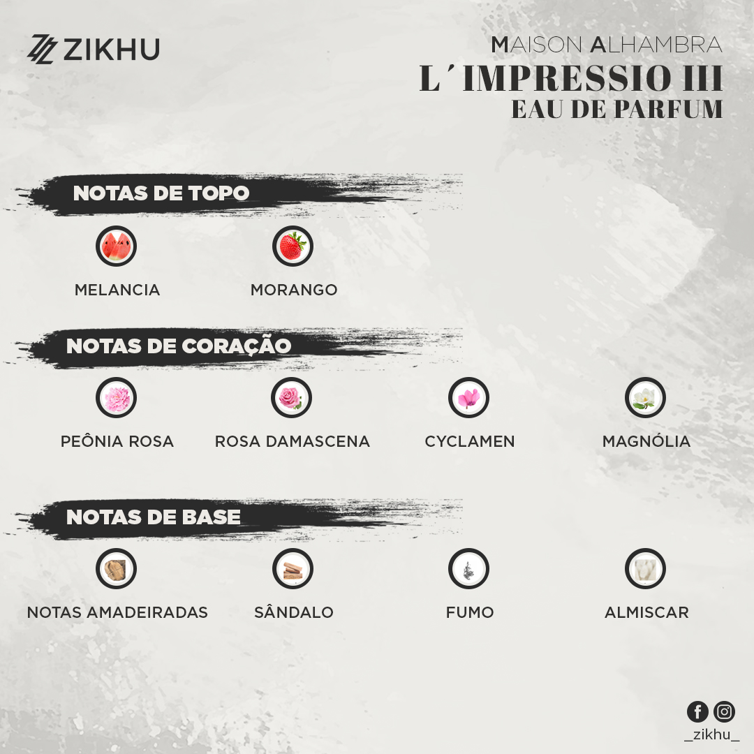 O L’Impressio da Maison Alhambra é uma fragrância feminina da família olfativa floral frutada, lançada em 2022. A sua composição começa com notas de topo de melancia e morango, criando uma abertura fresca e frutada. No coração, destacam-se as notas de peónia rosa, rosa damascena, ciclame e magnólia, conferindo um toque floral e elegante à fragrância. A base é composta por notas amadeiradas, sândalo, almíscar e um toque de fumo, proporcionando profundidade e sofisticação.
